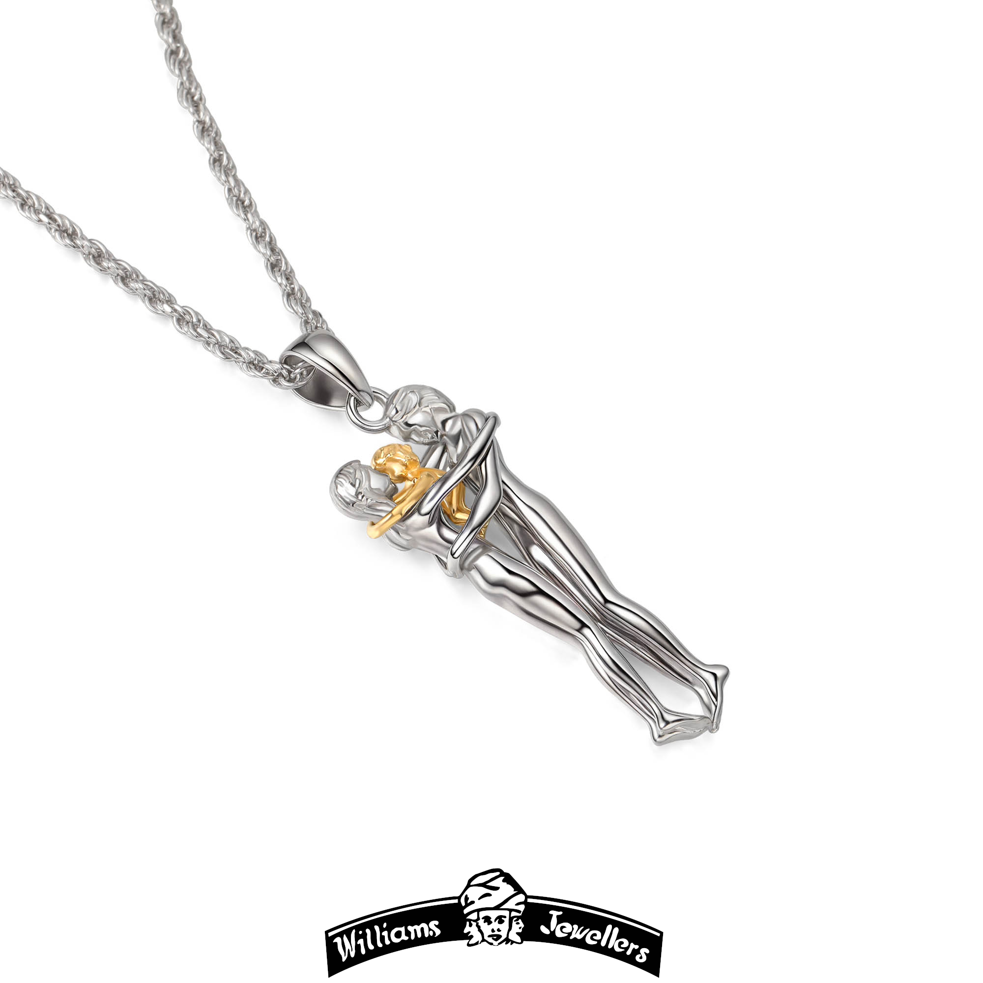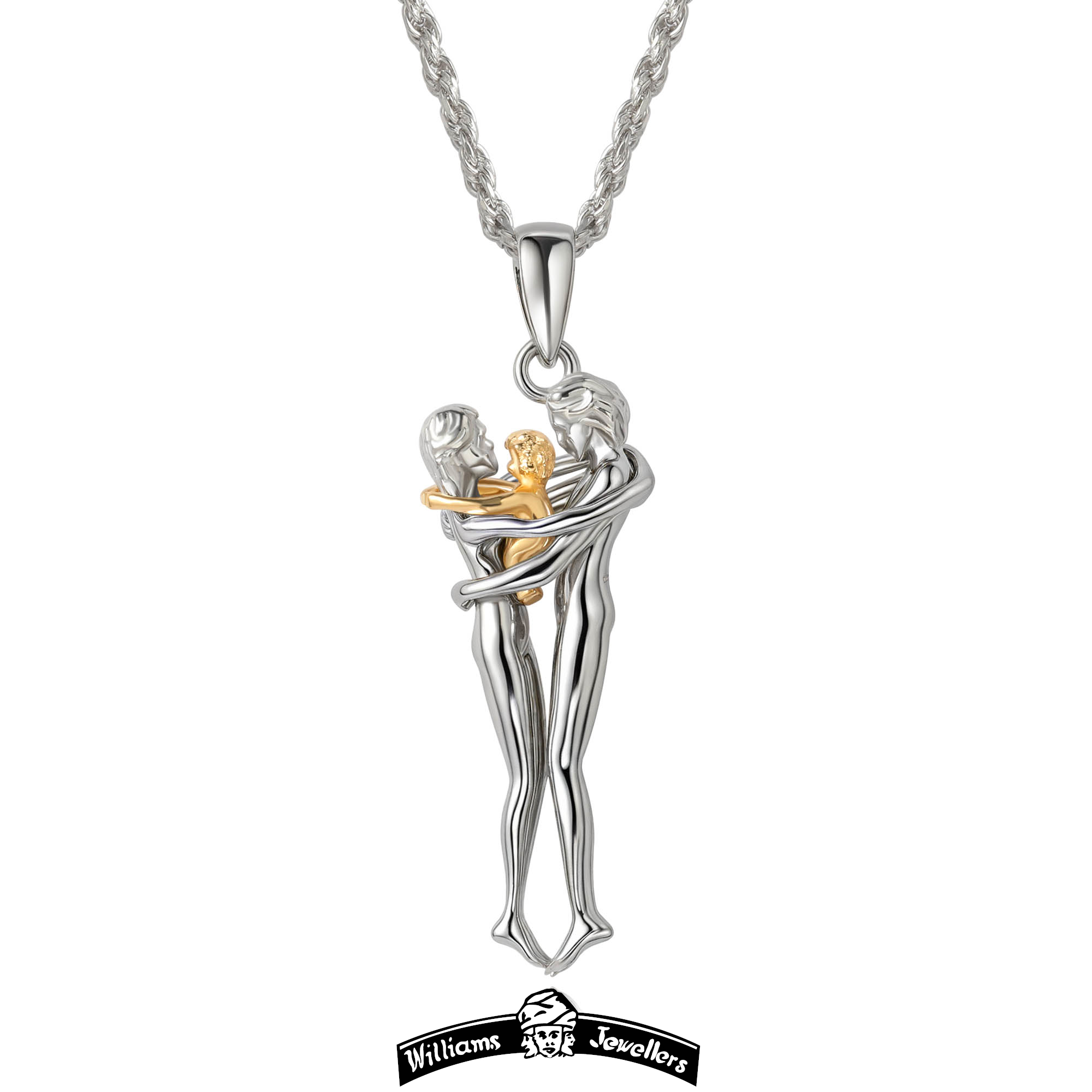 Family Hug Pendant, Sterling Silver & 18K yellow Gold. Also included 18 inch 2 mm Sterling Silver adjustable rope chain. For any other metal combinations please WhatsApp ANYTIME +13478614301